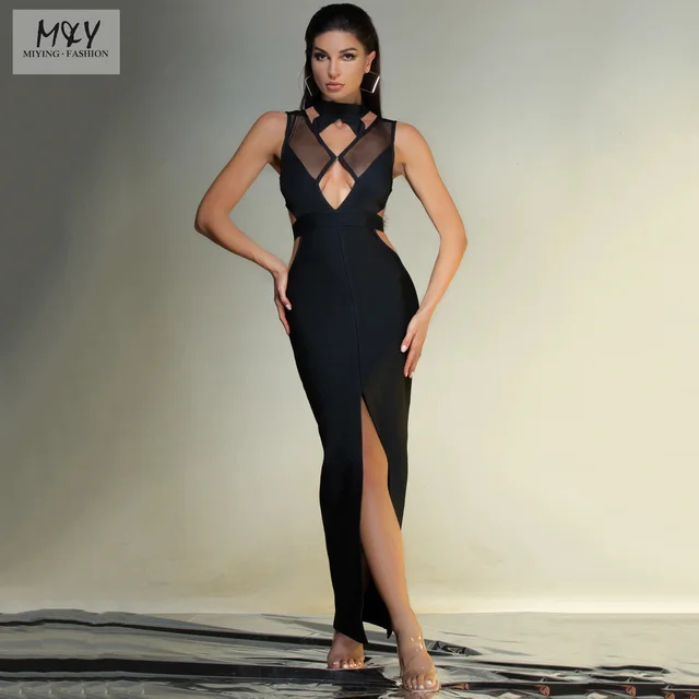 MIYING Fashion Black Bandage Evening Dress Sexy Hollow Cut Spliced Transparent Party Dress Elegant Slit Prom Evening Gown
